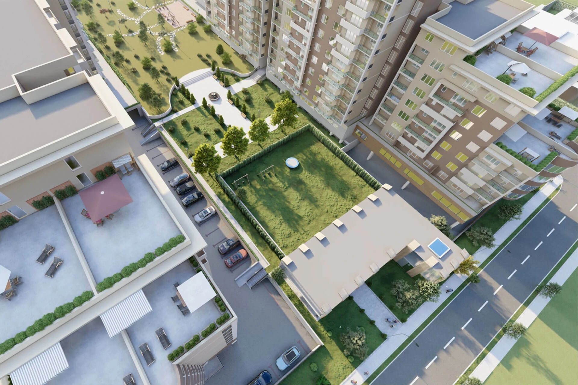 Aproape 40% din suprafață a fost dedicată exclusiv spațiilor verzi, parcurilor interne, zonelor de relaxare și chiar unei zone speciale pentru animalele de companie. Armonia Residence creează o oază reală cu copaci, gazon, locuri de joacă sigure și departe de traficul stradal. Un loc unde copiii tăi pot alerga liber, iar tu poți respira adânc fără să zgomotul orașului.